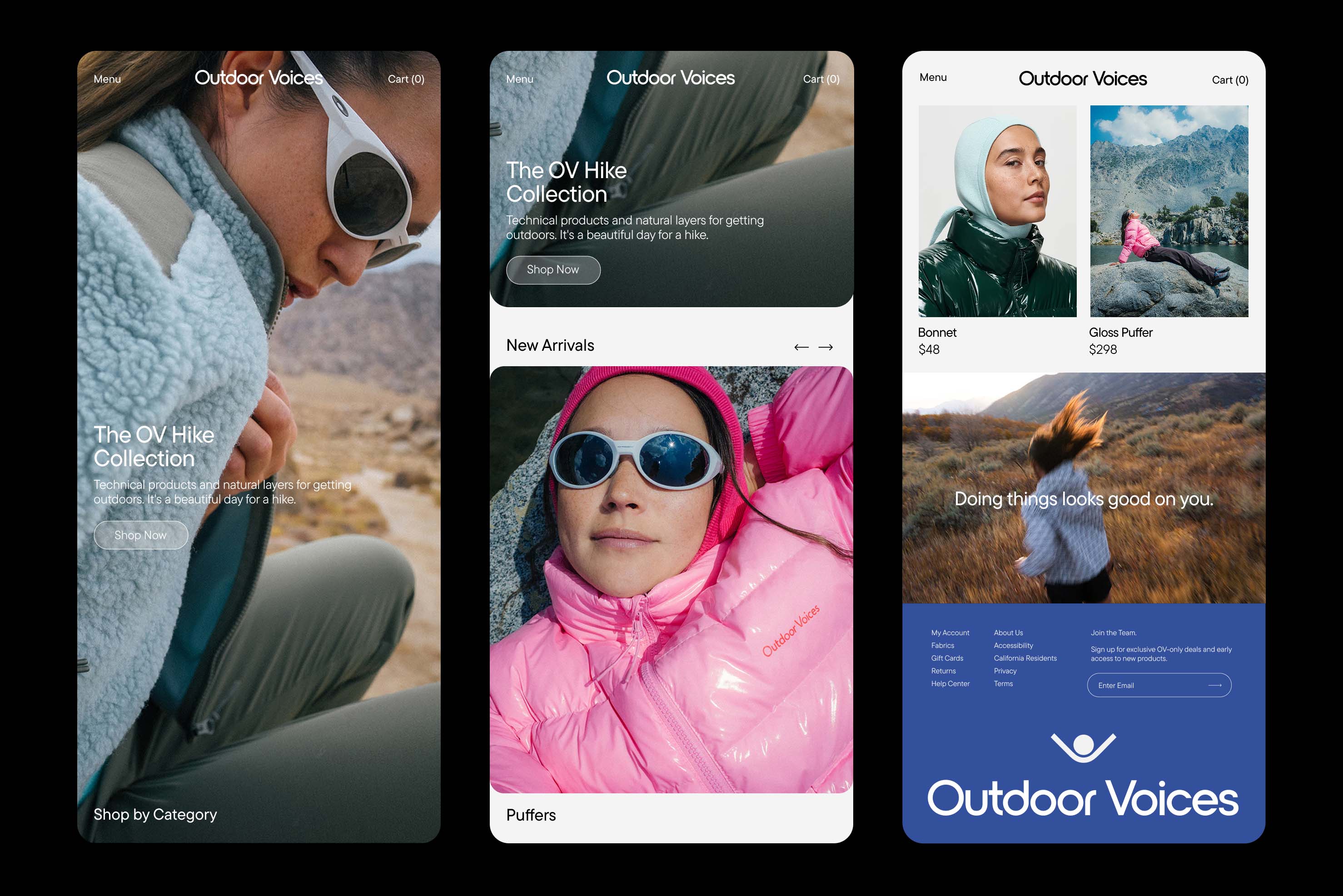 New logo and icon for Outdoor Voices. I led the brand re-design in partnership with Little Plains Agency. For this new chapter, Ty & Tiffany wanted an evolution to the iconic and recognizable OV branding. Something familiar, yet something new. Together, we chose a retro-styled typeface, Nordique Pro, and created a unique icon with similar line weight. I used the geometry of the O & the V to create a dynamic logomark designed for movement, recreation …and doing things. Lastly, I added in a secondary touched by hand OV script mark to match the playful-forward clothing, and signify a seal of approval from the OG OV leadership.
